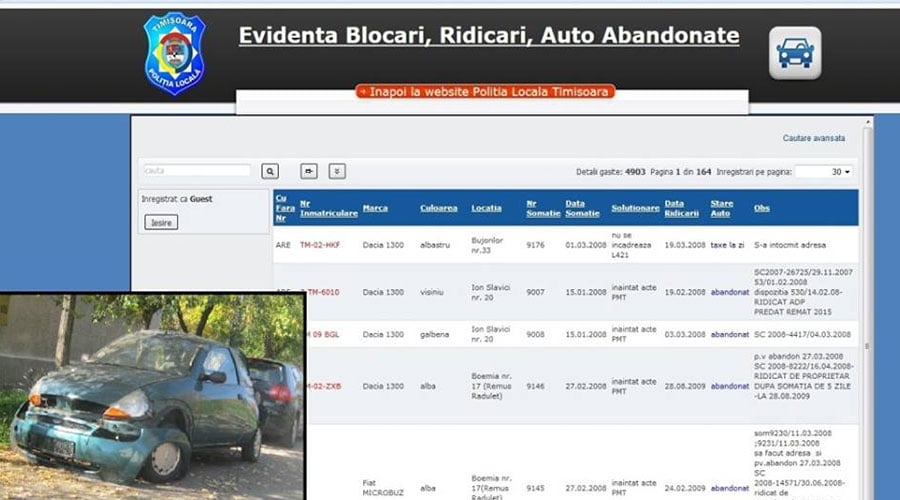 “Astfel, pentru a veni în sprijinul timișorenilor care cunosc astfel de autovehicule pe a fost creat un modul pagina de internet a Poliției Locale Timișoara, www.polcomtim.ro, respectiv www.polcomtim.ro/autoab , unde pot fi introduse datele autovehiculului care face obiectul sesizării și se poate afla dacă acesta a mai fost reclamat și dacă da în ce stadiu se află, aceasta în condițiile în care multe din mașinile semnalate de cetățeni se află în baza de date a Poliției Locale, în diferite stadii ale procedurii de verificare și declarate a abandonului”, au transmis reprezentanții Poliției Locale.