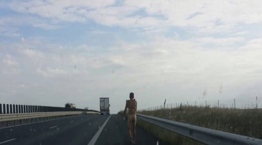 Aceștia au putut vedea un bărbat care se plimba, gol pușcă, pe banda de urgență a șoselei de mare viteză.