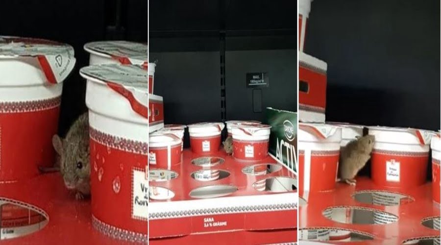 Șoricelul se plimba nestingherit printre cutiile de iaurt. Bărbatul oripilat de întreaga imagine a filmat și a pozat șoarecele, după care a postat totul pe internet.