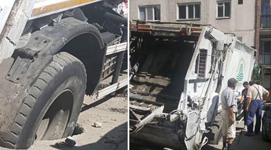 Maşină de gunoi, ÎNGHIŢITĂ de asfalt, după ce carosabilul s-a surpat