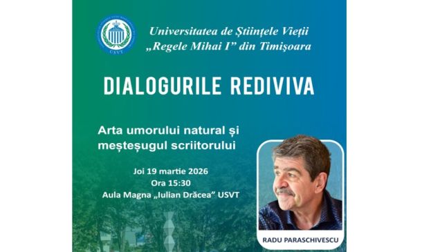 Universitatea de Științele Vieții „Regele Mihai I” din Timișoara organizează o nouă ediție a evenimentului cultural Dialogurile Rediviva, avându-l ca invitat pe unul dintre cei mai apreciați scriitori români contemporani, Radu Paraschivescu.