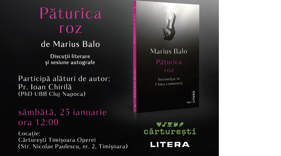 Volumul „Păturica roz. Întemniţat în China comunistă”, semnat de Marius Balo, o poveste autobiografică ce pornește de la experiențele traumatizante ale unui profesor român în detenția din China, timp de opt ani, va fi lansat sâmbătă, la Timișoara.
