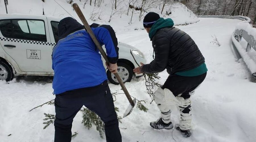 Jandarmii au ajuns după două ore la mașina înzăpezită, aceasta aflându-se într-o zonă greu accesibilă și închisă traficului public. Jandarmii montani, fiind nevoiți să curețe cu lopețile drumul pentru a putea continua deplasarea.