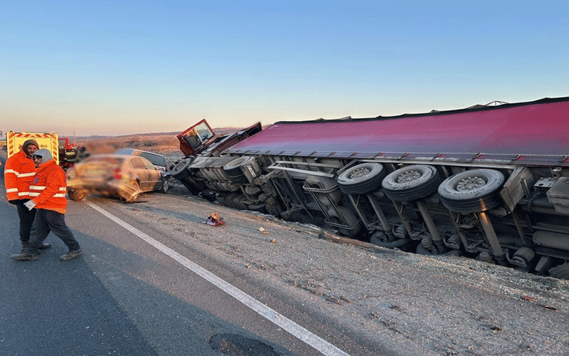 A pierdut controlul TIR-ului și a lovit două mașini parcate, apoi s-a răsturnat! Șoferul a murit
