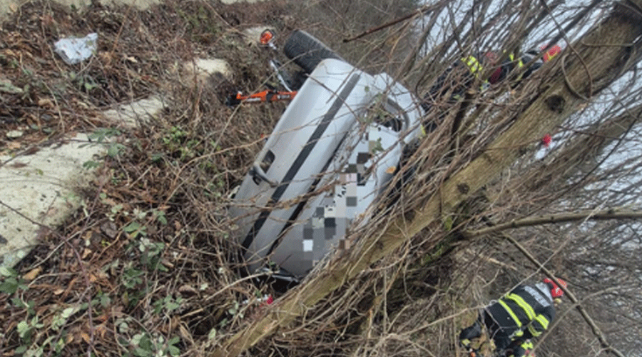 Șoferul a pierdut controlul asupra volanului, mașina s-a răsturnat și s-a oprit în copacii de pe marginea drumului.