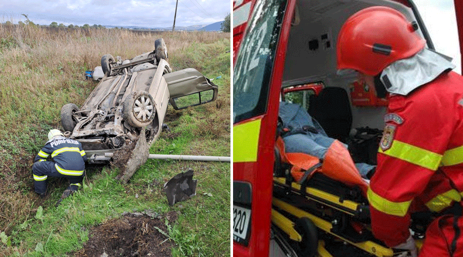 Accident cumplit! Șofer încarcerat, după ce s-a răsturnat cu mașina, pe câmpul de pe marginea drumului