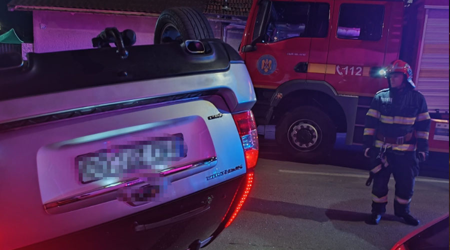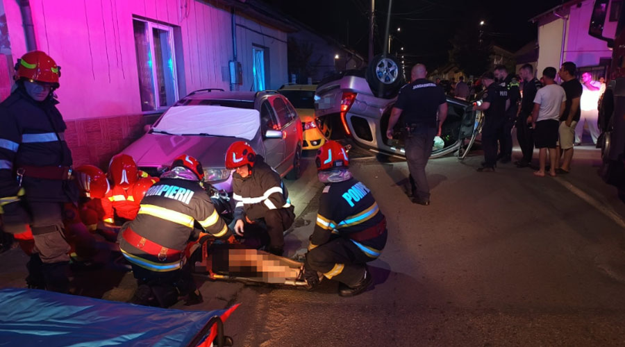 S-a dat alarma, în toiul nopții, după ce o mașină scăpată de sub control a lovit în plin, trei autoturisme parcate, dar și poarta unei case, după care s-a răsturnat cu roțile în sus.