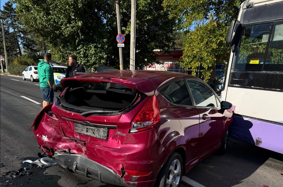 Accident în lanț, pe Calea Lugojului! O femeie a cărei mașină a fost proiectată în autobuz, a ajuns la spital!
