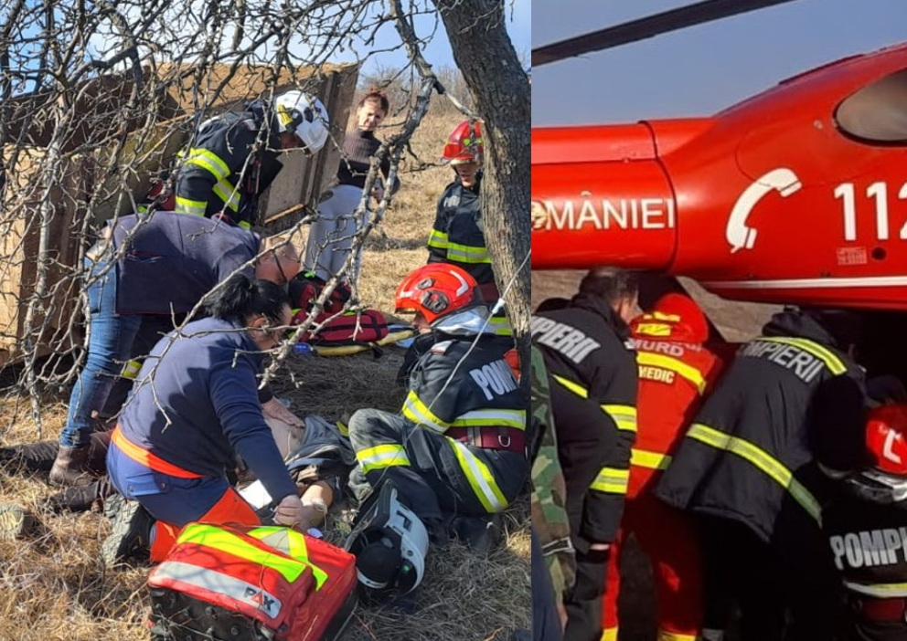 Accident înfiorător! Doi bărbați au fost striviți de remorca unui tractor care s-a răsturnat peste ei! A intervenit elicopterul SMURD
