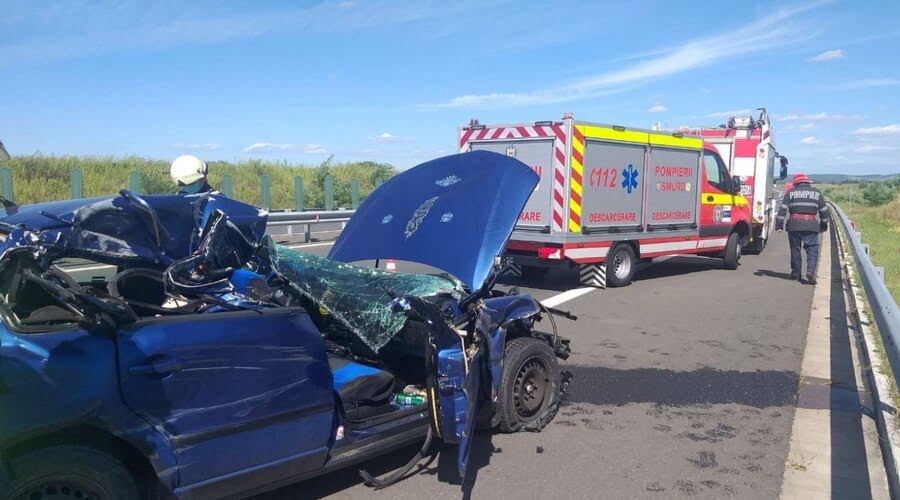 ”Am fost solicitați să intervenim pe autostrada A1, km 431, sensul de mers Lugoj-Deva. La fața locului s-au deplasat de urgență o autospecială de primă intervenție, o motocicletă SMURD, o autospecială de stingere cu modul de descarcerare, 2 echipaje SMURD și 15 pompieri. În accident au fost implicate o autoutilitară în care se afla șoferul și un autoturism in care se aflau 3 persoane. În urma impactului, o persoană din autoturism a fost aruncat în afara mașinii, ulterior fiind declarat decedat de către medicul sosit la fața locului. Celelalte 2 persoane din autoturism au fost transportate la spital pentru îngrijiri medicale”, transmit reprezentanții ISU Banat.