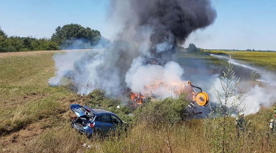 În urma impactului, vidanja a luat foc, aşa că a fost nevoie şi de intervenţia pompierilor.