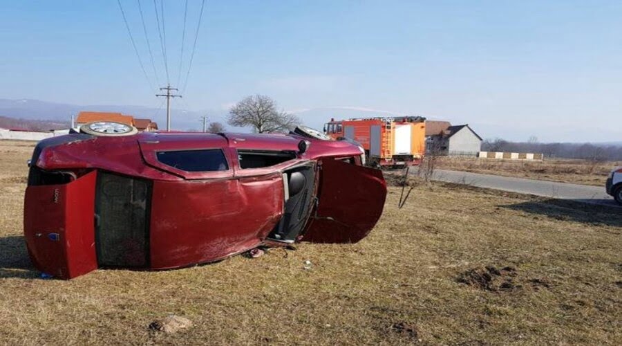 Accident spectaculos pe o șosea din Banat! O mașină a ieșit în decor, s-a răsturnat și a rămas pe o parte