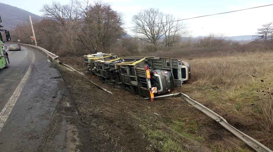 Un tir a ajuns cu roțile în sus, după ce s-a răsturnat într-o curbă, pe un drum din vestul țării.