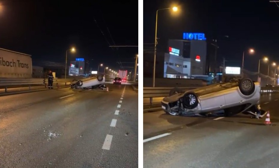 Accident grav, în această seară pe Calea Lugojului din Timișoara. Două mașini s-au ciocnit violent, iar unul dintre autoturisme s-a răsturnat pe plafon.