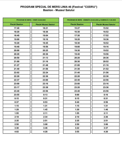Societatea de Transport Public Timișoara prelungește, începând de astăzi și până duminică inclusiv, programul de circulație al autobuzelor de pe linia 46 (Bastion – Muzeul Satului), pentru a facilita accesul publicului la CODRU Festival.