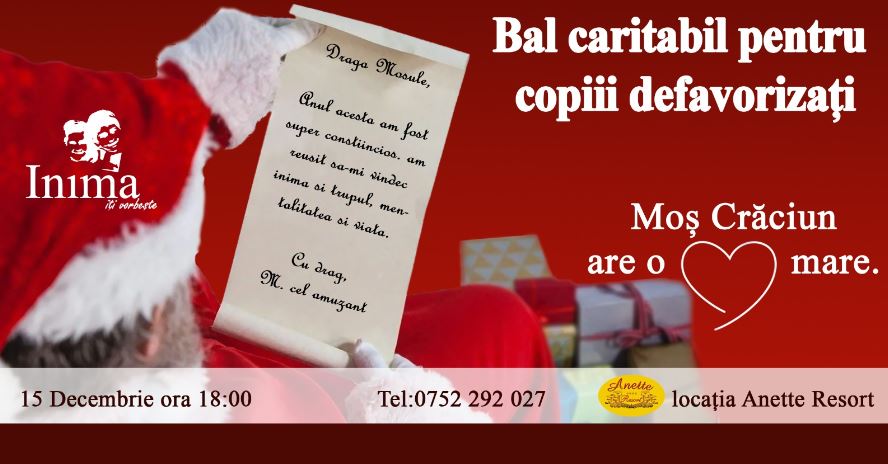 Balul va avea un program festiv de Crăciun: concert de colinde susținut de copiii din asociație, intrarea spectaculoasă a moșului cu sacul plin de cadouri, tombolă cu premii, invitați speciali care vor susține un program artistic cu surprize pentru copii, iar seara se va încheia cu o petrecere cu muzică, dans și voie bună.