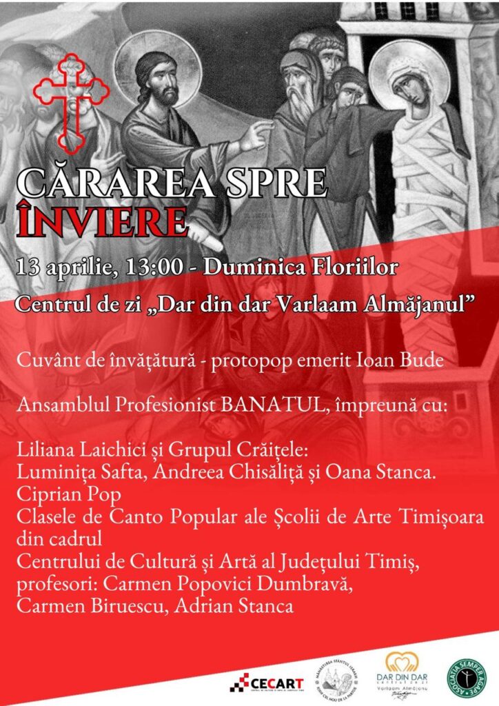 Centrul de Cultură și Artă al Județului Timiș în parteneriat cu Centrul de Zi ”Dar din dar Varlaam Almăjanu” și Mănăstirea Sf. Iosif cel Nou de la Partoș invită iubitorii de folclor și nu numai, în Duminica Floriilor, de la ora 13:00, la spectacolul ”Cărarea spre Înviere.”
