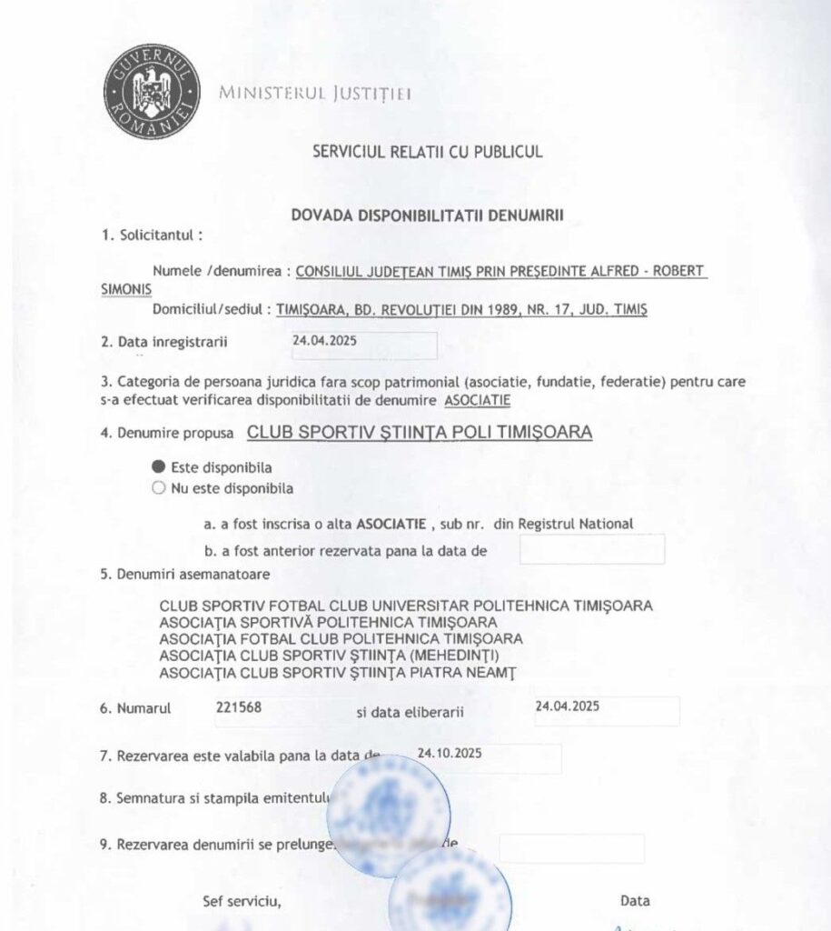 Ministerul Justiției și-a dat acordul pe numele propus de autorități, astfel că urmează înființarea propriu-zisă a Clubului Sportiv Știința Poli Timișoara.