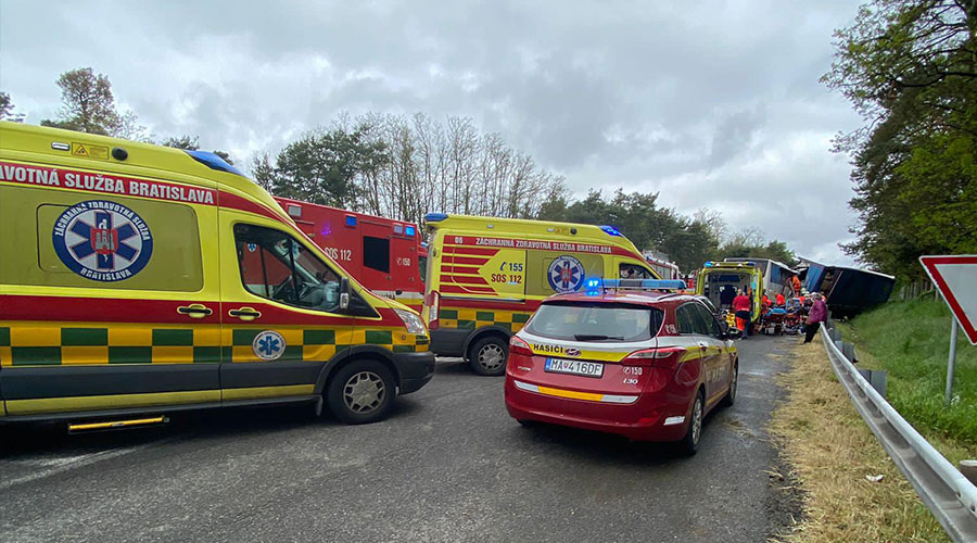 „Un accident rutier grav, produs astăzi pe autostrada D2 în direcția Kúty s-a soldat cu un mort şi 59 de răniţi. Peste 30 de pompieri din Malacky și Bratislava intervin la locul incidentului. Victimele cu răni minore se află în autobuzul de evacuare HAZZ (Serviciul de Pompieri şi Salvare din Bratislava) și în cortul brigăzii de salvare HAZZ din Malacky. Președintele HAZZ este și el la fața locului. Psihologii HAZZ oferă sprijin la fața locului”, transmite Serviciul de Pompieri şi Salvare din Bratislava