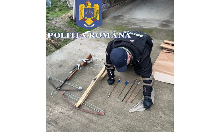 ”La data de 23 februarie 2024, polițiștii Serviciului Arme Explozibili și Substanțe Periculoase Hunedoara și Serviciului Criminalistic din cadrul Inspectoratului de Poliție Județean Hunedoara, au efectuat o percheziție domiciliară pe raza localității Geoagiu, județul Hunedoara, la locuința unui bărbat, ocazie cu care au fost identificate ca fiind deținute fără drept, două arbalete confecționate artizanal, un număr de 4 bucăți butelii CO2 nepercutate și un număr de 5 bucăți săgeți confecționate artizanal cu vârfuri metalice”, transmite IPJ Hunedoara.
