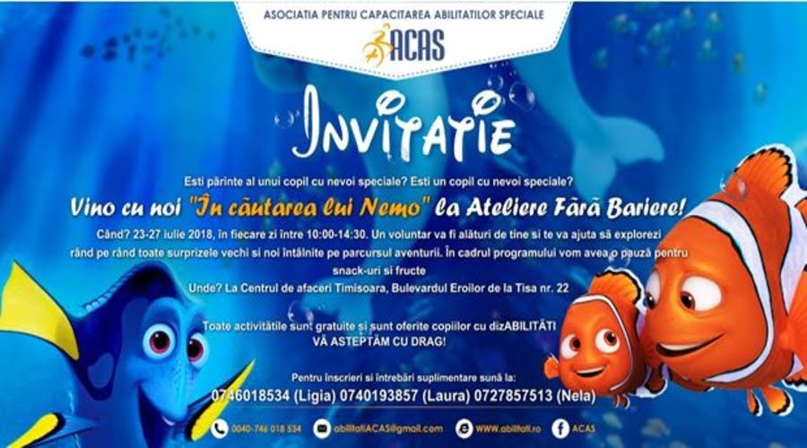 Sunt invitați părinții copiilor cu nevoi speciale, copiii cu nevoi speciale, voluntari, să descopere și să exploreze noi aventuri „În căutarea lui Nemo”. Evenimentul are loc în perioada 23 – 27 iulie 2018, la Centrul Regional de Afaceri al CCIA Timiș din Bdul Eroilor de la Tisa nr. 22, între orele 10.00 – 14.30.
