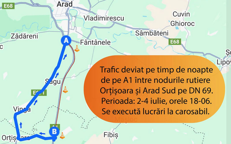 Astfel, în perioada 2-4 iulie, între orele 18:00 – 06:00, traficul se va desfășura deviat pe varianta de ocolire: Timișoara – A1 km 517+236 (nodul rutier Orțișoara) – DJ 693 – intersecție DJ 693, km 35+400 cu DN 69, km 23+432 (Orțișoara) – DN 69 Vinga, Șagu – A1 km 536+201 (nod rutier Arad Sud) – Arad.