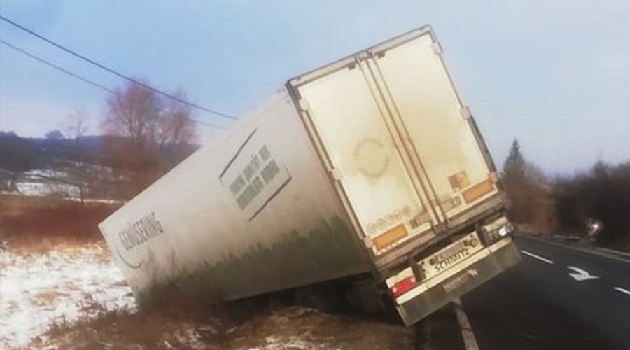 Aici, şoferul unui tir a pierdut controlul asupra direcţiei de mers, a părăsit şoseaua şi s-a răsturnat.