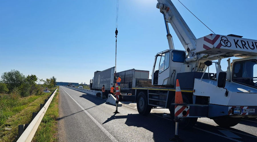 Atenție, șoferi! Traficul rutier este îngreunat, la această oră, pe Centura de Nord a Timișoarei! Se montează parapete din beton, pe mijlocul drumului!