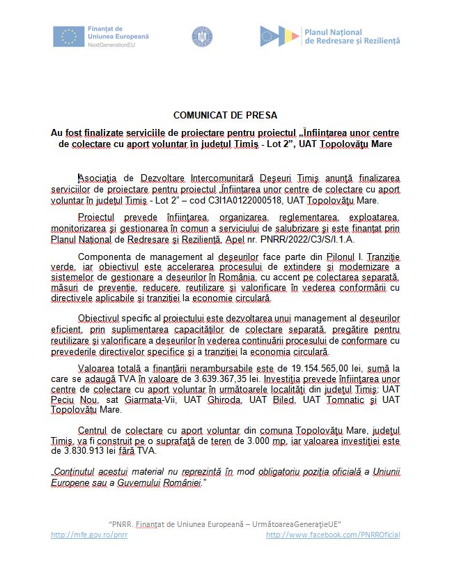 Asociaţia de Dezvoltare Intercomunitară Deşeuri Timiş anunţă finalizarea serviciilor de proiectare pentru proiectul „Înființarea unor centre de colectare cu aport voluntar în județul Timiș – Lot 2” – cod C3I1A0122000518, UAT Topolovăţu Mare.