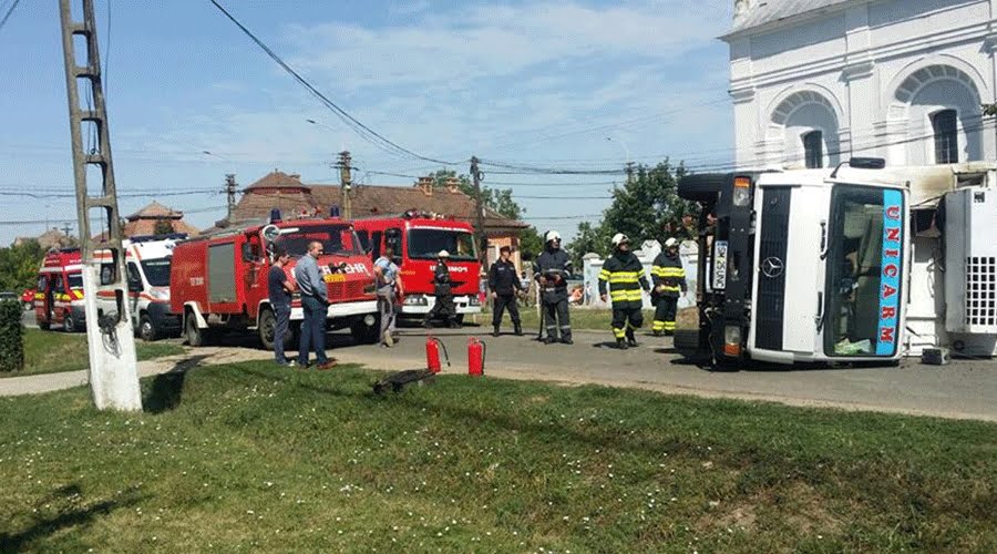 Un camion care făcea aprovizionarea cu mezeluri în mai multe magazine a fost implicat într-un accident de circulație.