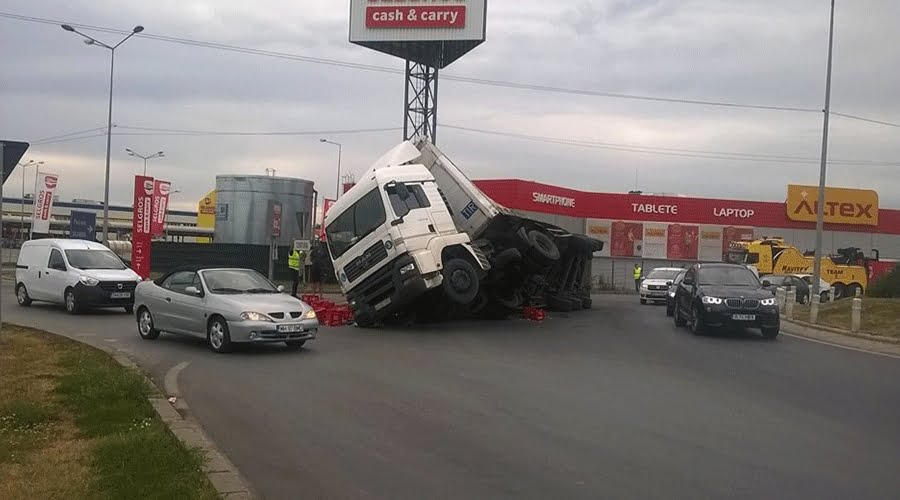 Circulația la ieșire din Timișoara s-a desfășurat îngreunat în această dimineață! Un tir încărcat cu băuturi răcoritoare s-a răsturnat într-un sens giratoriu.