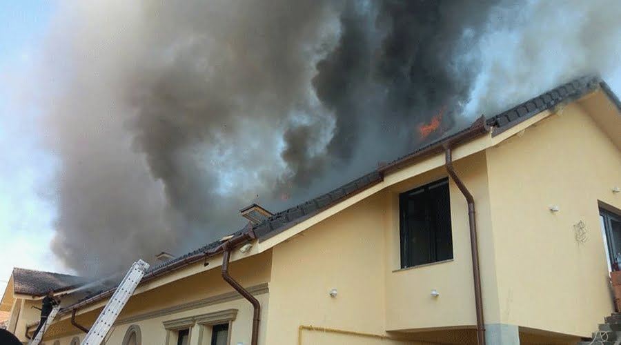 80% din acoperișul unei case funerare a ars ca o torță astăzi, în urma unui scurt circuit.