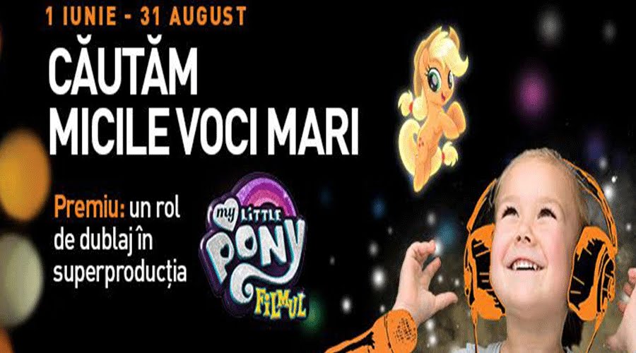 Cinema City porneşte din nou în căutarea „Micilor Voci Mari”! Dacă ai un copil talentat, căruia îi plac filmele, oferă-i şansa de a ajunge vedetă şi înscrie-l în aplicaţia Micile Voci Mari, prin care poate da o probă de voce care îi poate aduce un rol de dublaj în super-animaţia „My Little Pony: Filmul”.