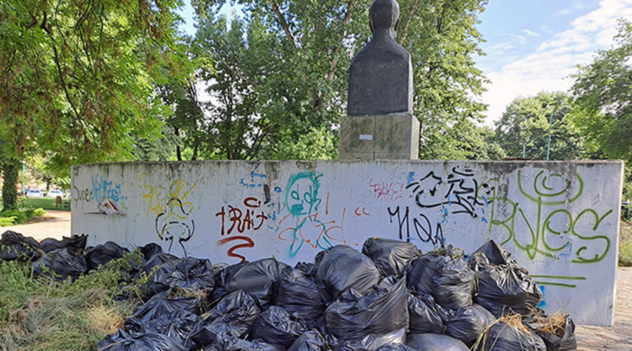 Bătaie de joc, în centrul Timişoarei! Statuia lui Brătianu, străjuită de saci plini cu gunoaie