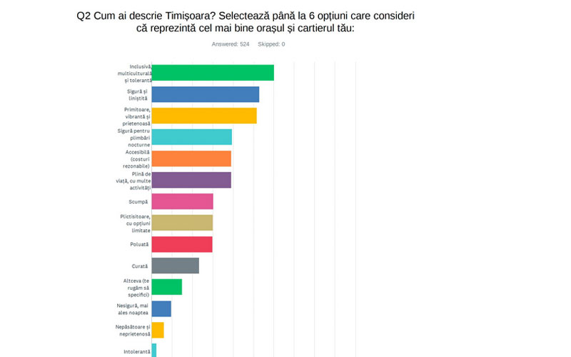 „Ne-a impresionat deschiderea și dorința de implicare a localnicilor. Timișoara se află în topul orașelor în care am lucrat, în ceea ce privește rata ridicată de răspuns și calitatea feedback-ului primit. O particularitate a fost numărul mare de răspunsuri deschise, un semn clar că locuitorii au așteptări și vor să fie o parte din dezvoltare„, a explicat Barry Rogers, director Toposophy, coordonatorul echipei pentru Timișoara.