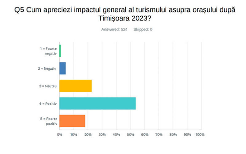 Cea de-a doua direcție a cercetării s-a derulat în luna mai, în cadrul unui sondaj de opinie în rândul locuitorilor Timișoarei. Rezultatele sondajului arată o percepție majoritar pozitivă asupra orașului: 59,9% dintre timișoreni îl consideră „inclusiv, multicultural și tolerant”, 52,9% „sigur”, iar 51,4% „primitor, vibrant și prietenos”. În ceea ce privește impactul turismului după anul Capitalei Culturale, o largă majoritate (71,8%) îl apreciază ca fiind pozitiv sau foarte pozitiv.