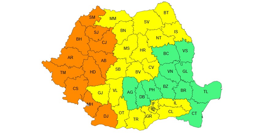 Codul galben vizează Maramureșul, sudul și estul Transilvaniei, jumătatea de nord a Moldovei, estul și nordul Olteniei și jumătatea sudică a Munteniei. Aici se vor înregistra temperaturi deosebit de ridicate pentru această dată și va fi disconfort termic. Indicele temperatură-umezeală (ITU) local va depăși ușor pragul critic de 80 de unități.