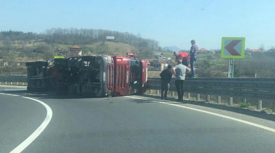 Șoferul camionului a pierdut controlul volanului într-o curbă, autovehiculul a intrat în balans și s-a răsturnat.