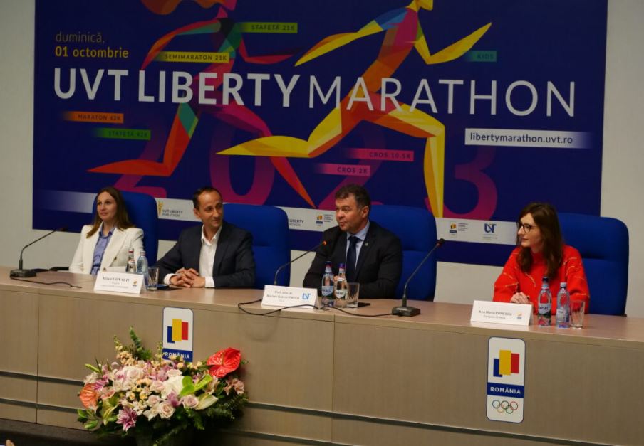 Anunțarea noului Ambasador UVT Liberty Marathon pentru competiția din 2023 a fost prilejuită de un eveniment organizat astăzi la sediul COSR, la care au fost prezenți Mihai Claudiu Covaliu, președintele COSR, Marilen Gabriel Pirtea, rectorul UVT, alături de campioana olimpică Ana Maria Brânză și Simona Amânar Tabără, directorul Academiei Olimpice Române.