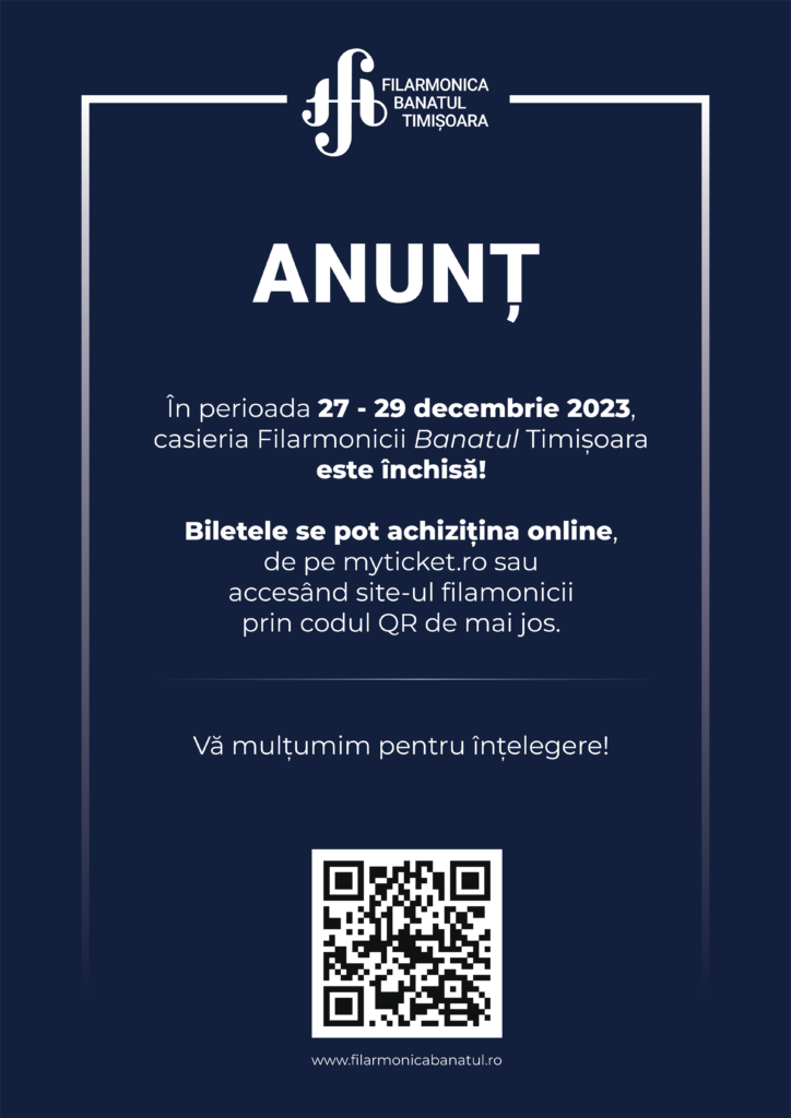Filarmonica Banatul Timișoara anunță publicul că în perioada 27 – 29 decembrie 2023, casieria instituției va fi închisă.