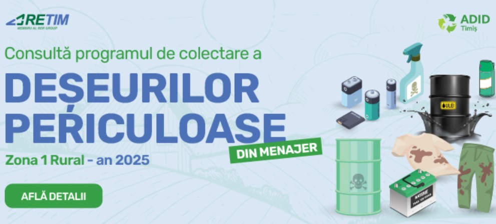 RETIM Ecologic Service S.A. și ADID Timiș informează locuitorii din Zona 1 Rural a județului Timiș despre importanța colectării separate a deșeurilor periculoase din menajer.