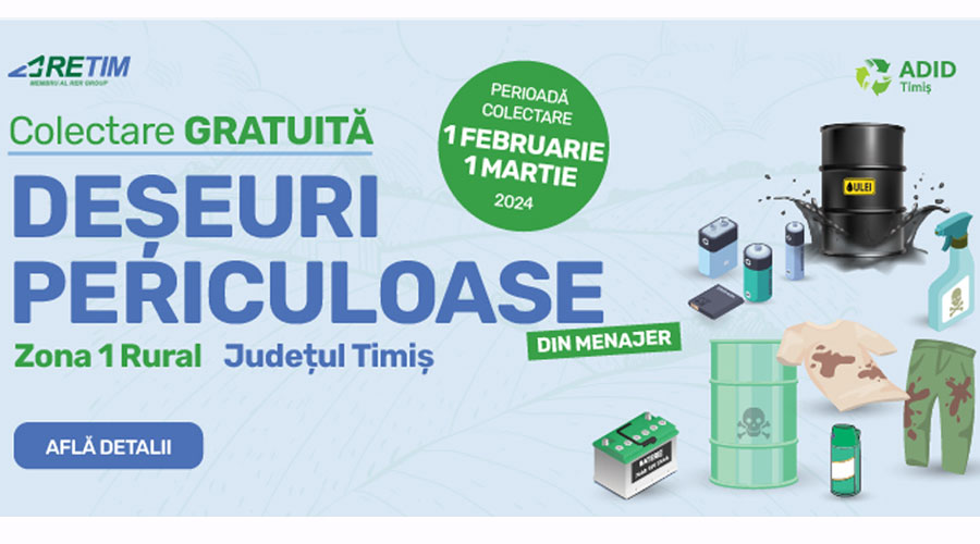 Astfel în perioada 01 februarie – 01 martie 2024 se desfășoară o campanie de colectare gratuită a deșeurilor periculoase din menajer din Zona 1 rural a judeţului Timiş în localitățile Șandra, Iecea Mare, Bucovăț, Parța, Mașloc, Pișchia, Fibiș, Cărpiniș, Cenei, Checea, Foeni, Otelec, Uivar, Dudeștii Noi, Becicherecu Mic, Satchinez, Biled, Giulvăz, Peciu Nou, Variaș, Sânandrei și Săcălaz.