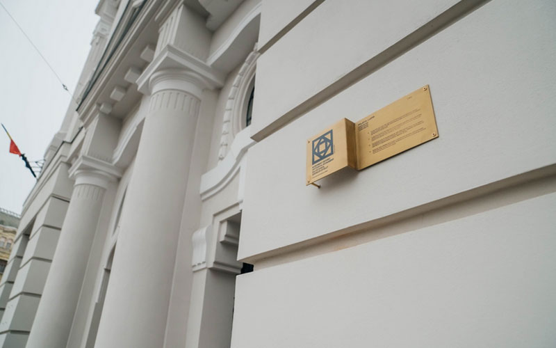 Plăcuțele oferă informații privind statutul de monument istoric al clădirii în limbile română, engleză, germană și maghiară.