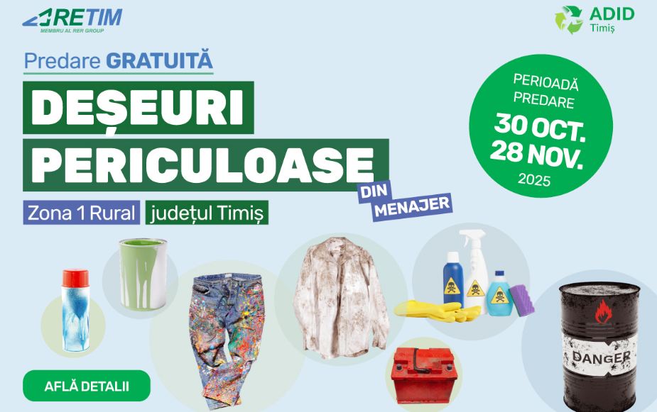 Colectarea deșeurilor periculoase din menajer, cu predare gratuită, în Zona 1 Rural a județului Timiș – Campanie RETIM și ADID Timiș 2025!