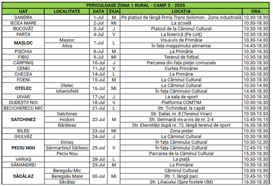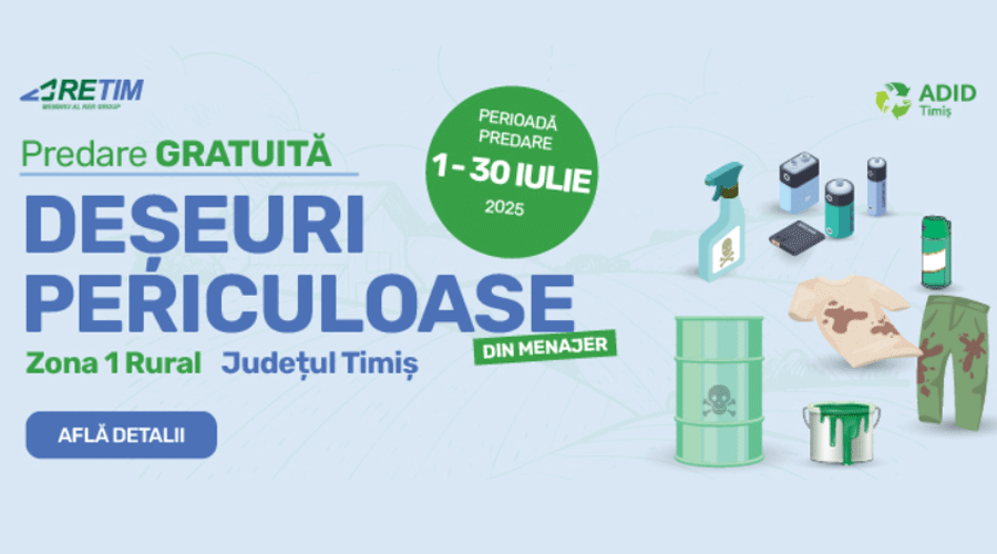 În perioada 01 – 30 iulie 2025, în Zona 1 Rural a județului Timiș, înlocalitățile: Șandra, Iecea Mare, Bucovăț, Parța, Mașloc (și în Alioș), Pișchia, Fibiș, Cărpiniș, Cenei, Checea, Foeni, Otelec (și în Iohanisfeld), Uivar, Dudeștii Noi, Becicherecu Mic, Satchinez (și în Hodoni și Bărăteaz), Biled, Giulvăz, Peciu Nou (și în Diniaș și Sânmartinul Sârbesc), Variaș, Sânandrei și Săcălaz (și în Beregsău Mic și Beregsău Mare), RETIM și ADID Timiș organizează o nouă campanie de predare gratuită a deșeurilor periculoase din menajer.