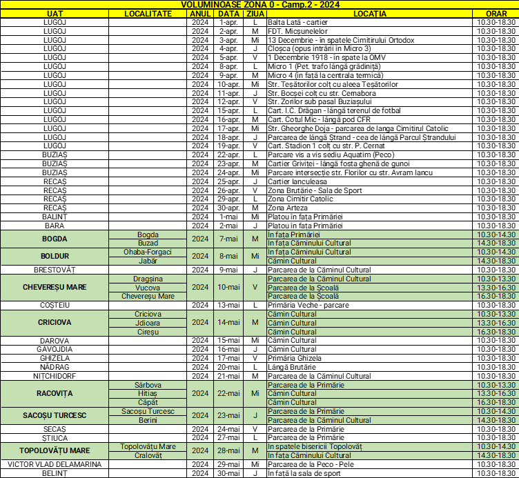 Cetățenii din localităţile menţionate mai sus pot depune prin aport voluntar și gratuit deșeurile voluminoase în containerele special puse la dispoziție în punctele de colectare și între orele menționate în tabelul de mai jos.