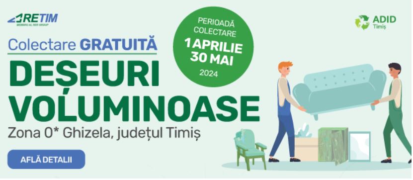 Compania RETIM împreună cu ADID Timiș organizează în perioada 01 aprilie – 30 mai 2024 o campanie de colectare gratuită a deșeurilor voluminoase din Zona 0 Ghizela a judeţului Timiş. Sunt cuprinse localitățile Lugoj, Buziaș, Recaș, Balinț, Bara, Bogda (și în Buzad), Boldur (Ohaba – Forgaci și Jabăr), Brestovăț, Chevereșu Mare (și în Dragșina și Vucova), Coșteiu, Criciova (și în Jdioara și Cireșu), Darova, Găvojdia, Ghizela, Nădrag, Nițchidorf, Racovița (Sârbova, Hitiaș și Căpăt), Sacoșu Turcesc (și în Berini), Secaș, Știuca, Topolovățu Mare (și în Cralovăț), Victor Vlad Delamarina și Belinț.