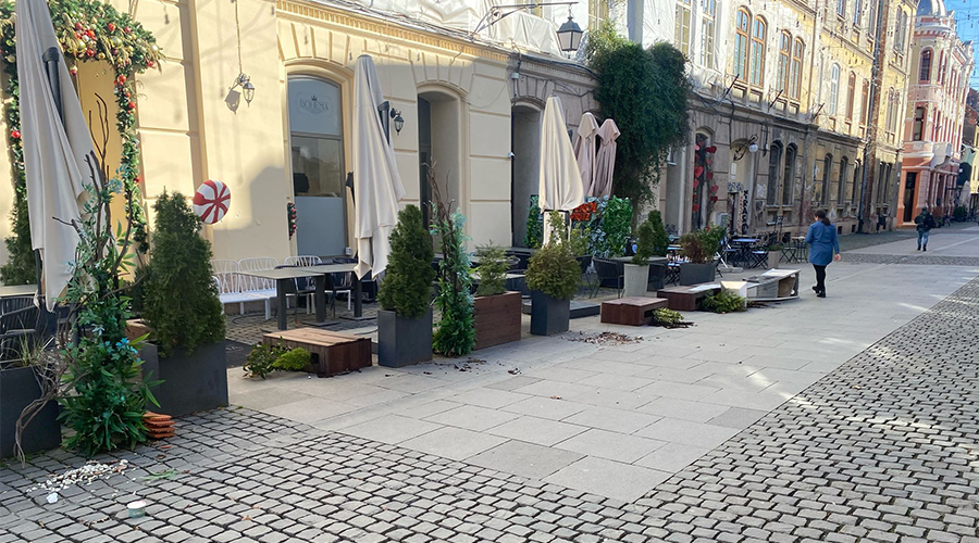 În centrul Timișoarei, rafalele puternice au luat pe sus mobilierul și umbrelele de la terase, au fost puse la pământ ghivece cu flori, iar de pe clădiri au fost desprinse bucăți de tencuială.