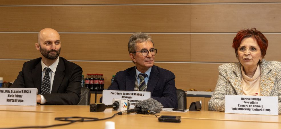 ”În 2023 august am semnat un protocol de colaborare cu Spitalul Clinic Județean de Urgență Pius Brânzeu și am lansat acest proiect, ”Spitalul nostru”. Noi avem menirea de a oferi un cadru între mediul de afaceri și reprezentanții spitalului și mai mult de a duce la cunoștință mediului de afaceri aceste proiecte, și până la urmă de a vă conștientiza cumva, de a veni cu donații pentru proiectele la care dumneavoastră vă doriți. Astăzi, așa cum vedeți, avem alături de domnul profesor Dorel Săndesc, pe domnul profesor doctor Andrei Brânzeu. Și o să vorbim despre două dintre aceste proiecte care le-am menționat, despre neurochirurgie pediatrică și despre toalete”, a spus Florica Chiriță, președinte al Camerei de Comerț Industrie și Agricultură Timiș.