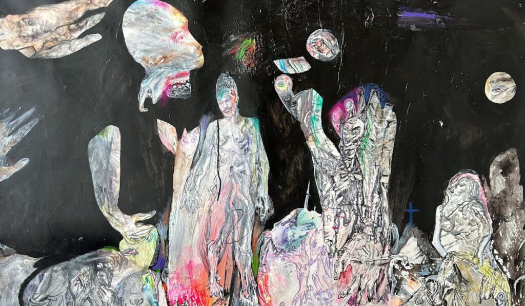 Expoziția aduce pe simeze aproximativ 40 de lucrări realizate în ultimii ani. Artistul a ales aproximativ 25 de lucrări pe hârtie și intervenții pe fotografii și suporturi alternative, alături de alte 15 lucrări pe pânză de dimensiuni foarte mari și medii din seriile Pour les privés d’amour et de pinard, Pigerolles, Corsica – Biguglia (2016 – 2024). Lucrările făcute la Timișoara reprezintă rememorări și revizitări ale desenelor realizate în Corsica între anii 2021 – 2024, transpuse în aceeași tehnică (pastel, cărbune, marker) pe formate mari ori panoramice.